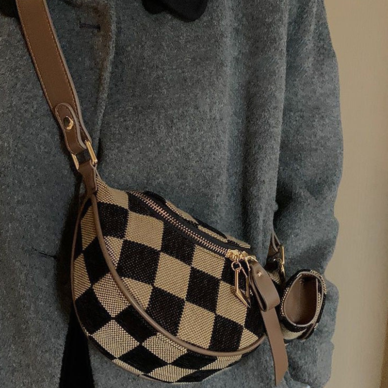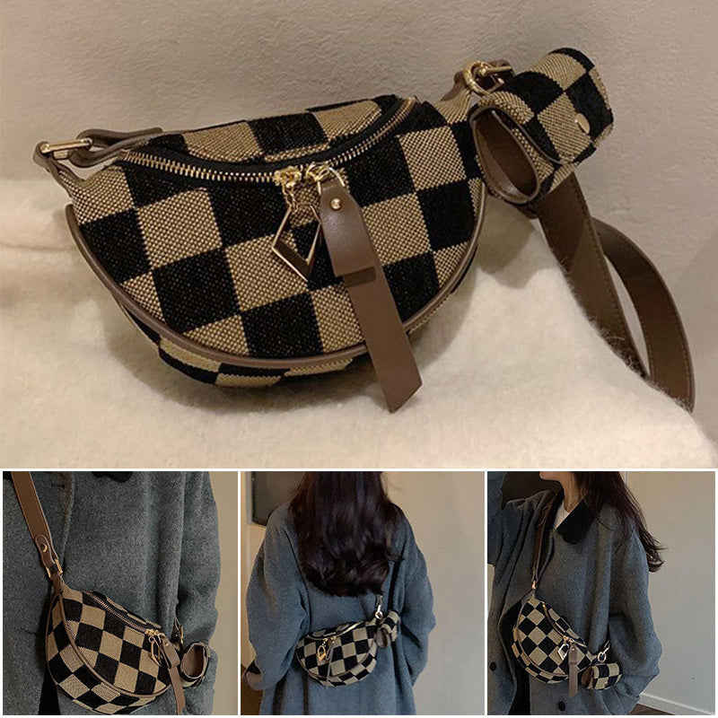 [Versatile Design]: This Fanny Pack Crossbody Bag for Women is a stylish and functional choice. It is made of canvas on the surface with a checkered pattern and polyester fabric on the inside. It features a medium-soft structure and an adjustable shoulder strap. Wear it as a crossbody bag, waist pack, or chest bag to suit your style and comfort.