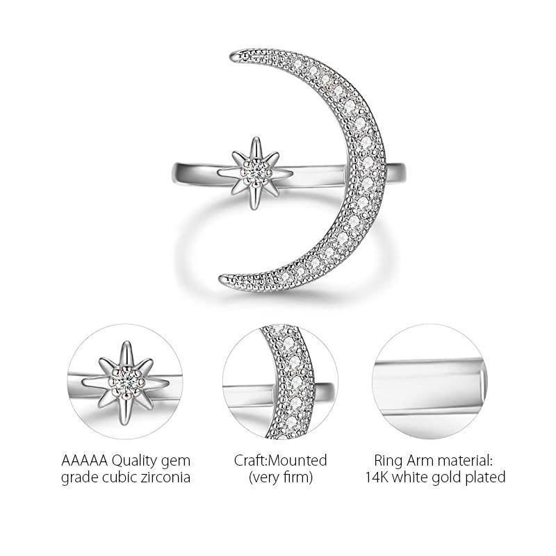 - Adjustable opening ring: young stylish design, suitable for any stage females (women and teens). Adjustable ring without sizes, everyone can wear the silver moon ring.