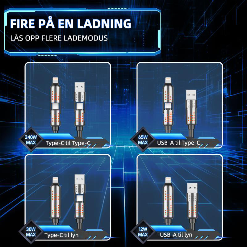 - 4-i-1 multiladingsløsning: Strømlinjeform ladebehovene dine med vår 4-i-1 USB-C-kabel. Den kombinerer fire tilkoblinger – USB-C til Lightning, USB-C til USB-C, USB-A til USB-C og USB-A til Lightning – til én praktisk kabel som dekker alle dine hurtigladings- og dataoverføringskrav.