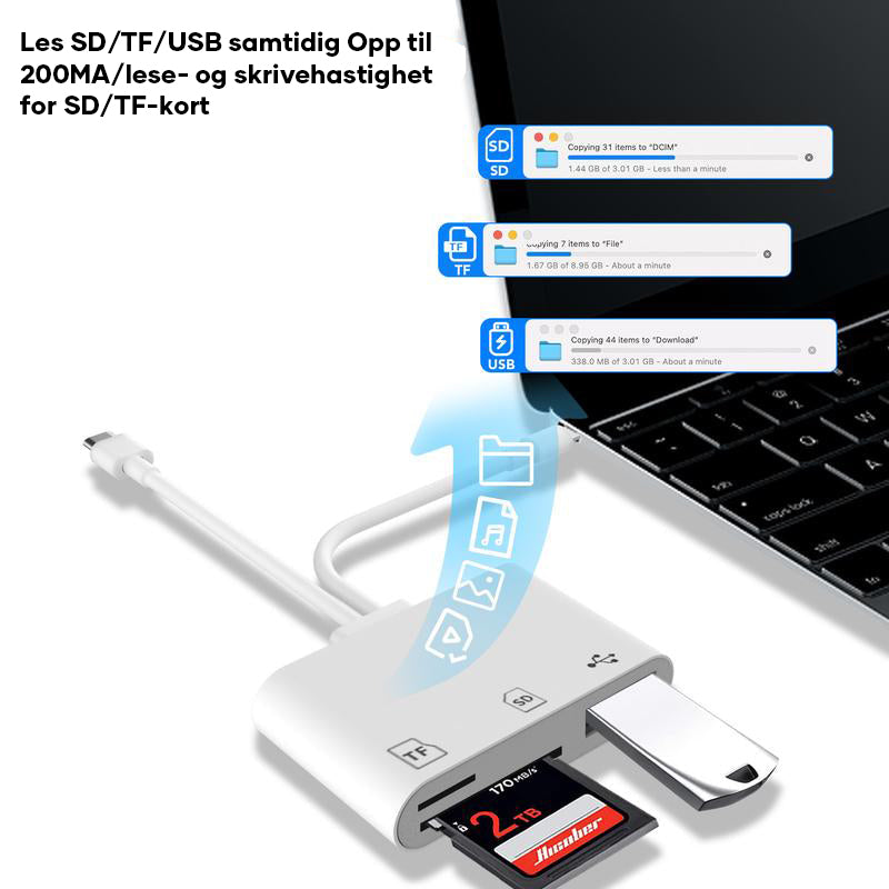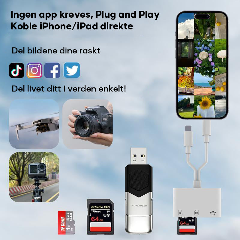 Toveisoverføring: SD-kortleseren for iPhone støtter toveisoverføring, fra SD-kort til iPhone eller iPhone til SD-minnekort.