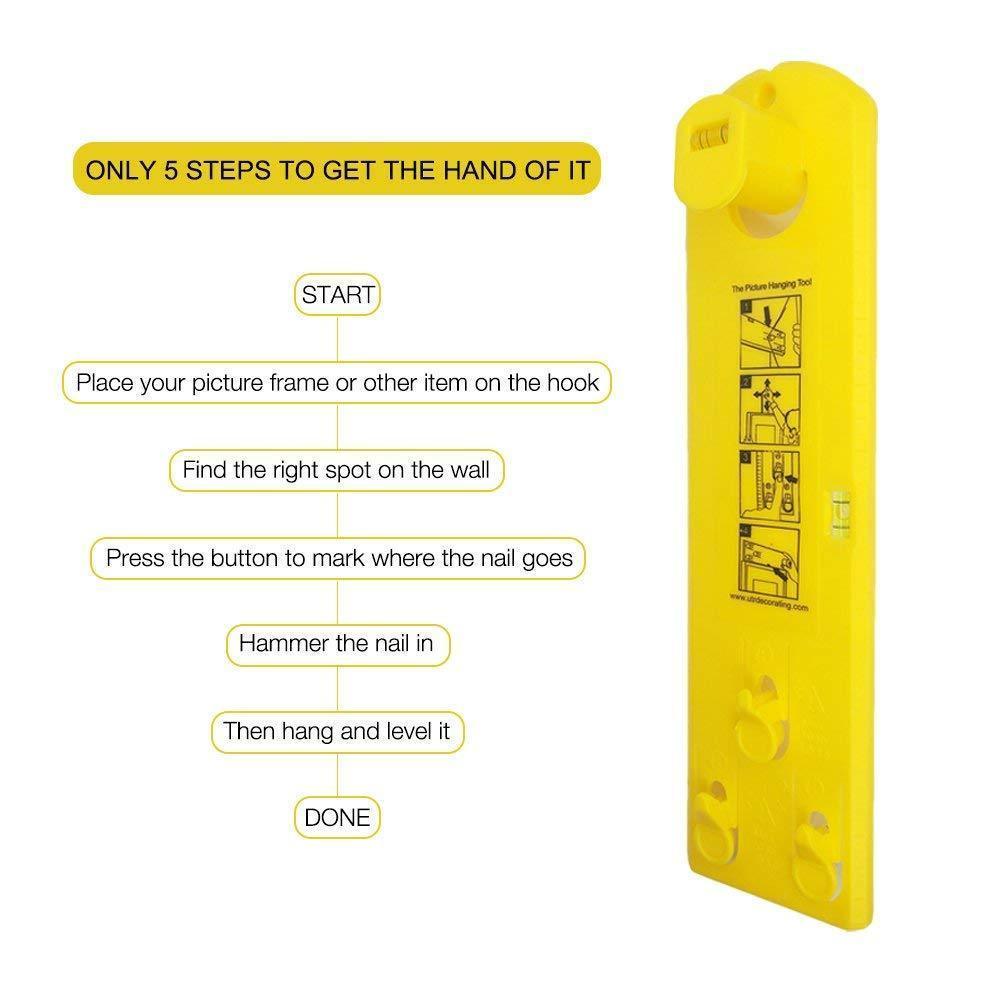 5. Simply place your picture frame or other item on the hook, find the right spot on the wall, press the button to mark where the nail goes, hammer the nail in, then hang and level it. You're done.