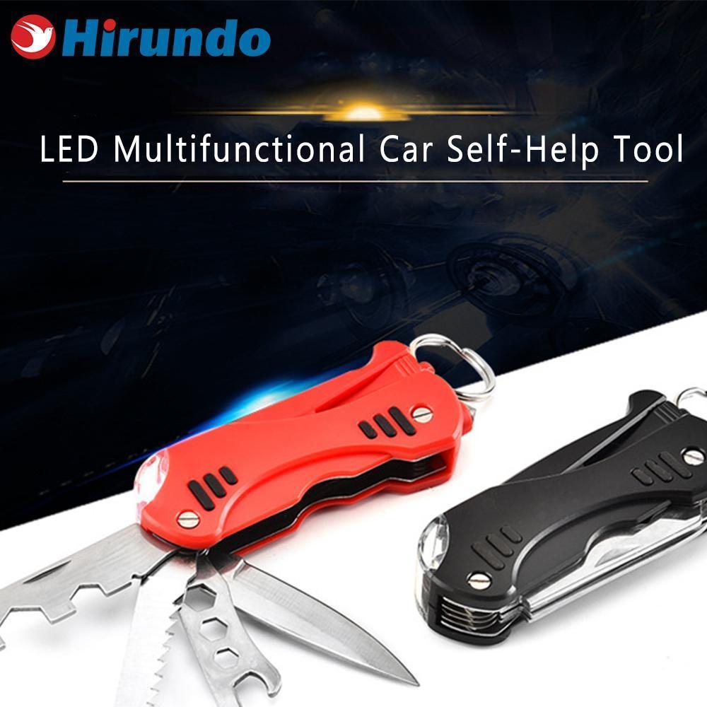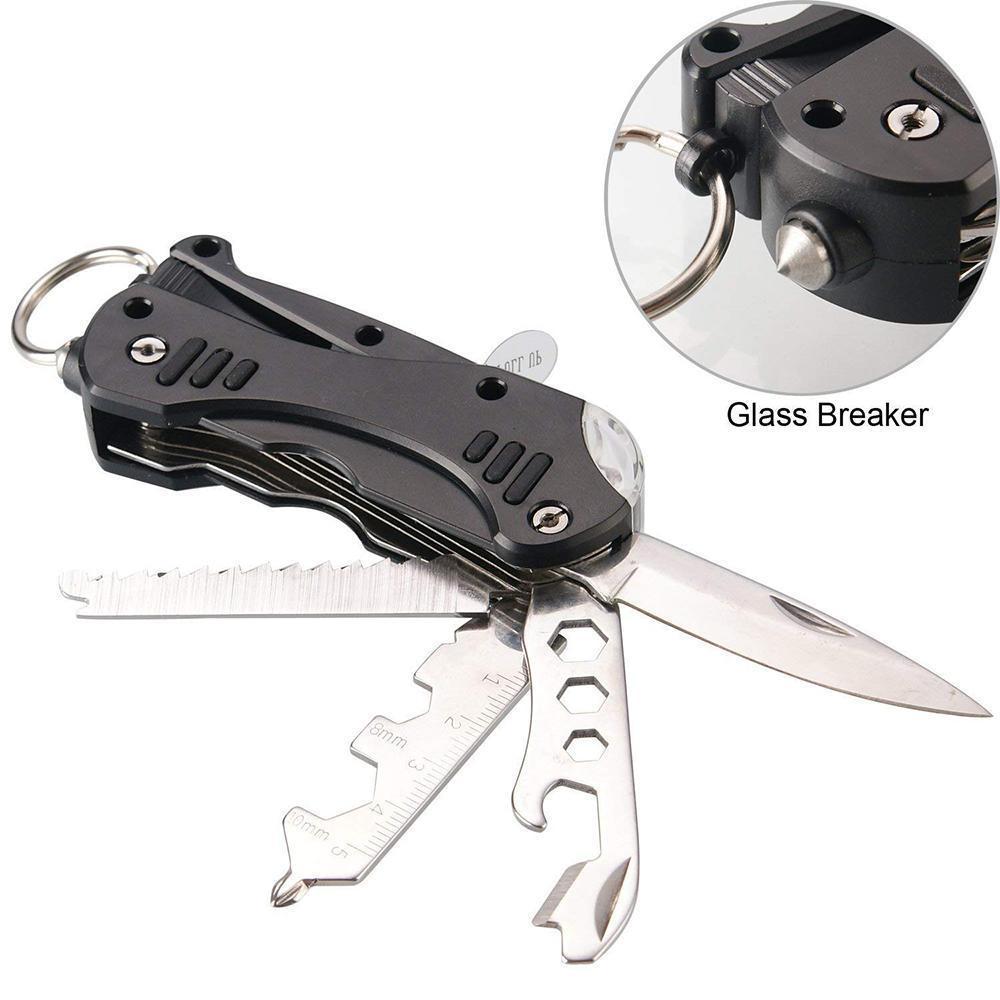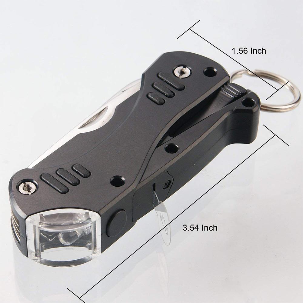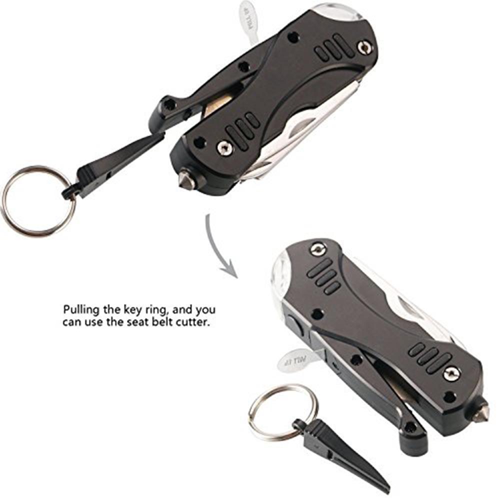 - Multifunctional tool design that can be used as wrench, screwdriver, bottle opener, knife, broken window hammer, key ring, LED light, etc.