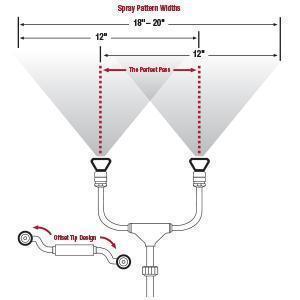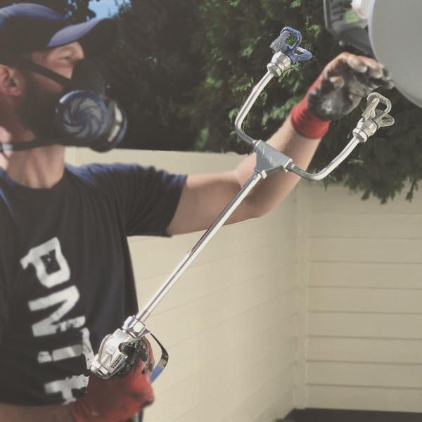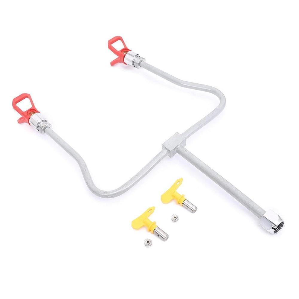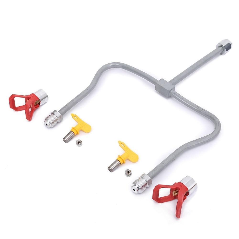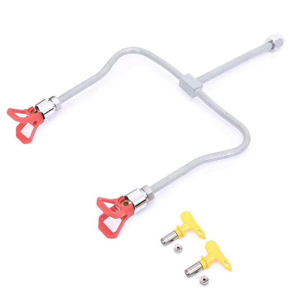 This airless spray tip extension has two tips spaced 6 inches apart that deliver a spray fan that’s twice the width of a spray gun or single-tip extension.