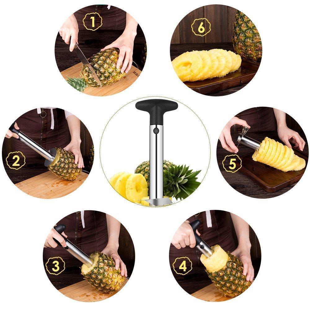 - PRACTICAL FAST& EASY - Pineapple peeler quick and easy no more messy ,simply cut the crown of the pineapple off, turning slowly pineapple cutter effortlessly core and slice pineapple in seconds.Pineapple de-corer peeler make cutting a pineapple so much fun and easy!