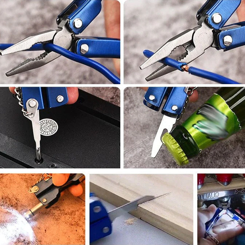 - The 8-in-1 multifunctional tool includes needle nose pliers, locking pliers, wire cutter, knife, cross screwdriver, flat screwdriver, bottle opener, saw, and flashlight.
