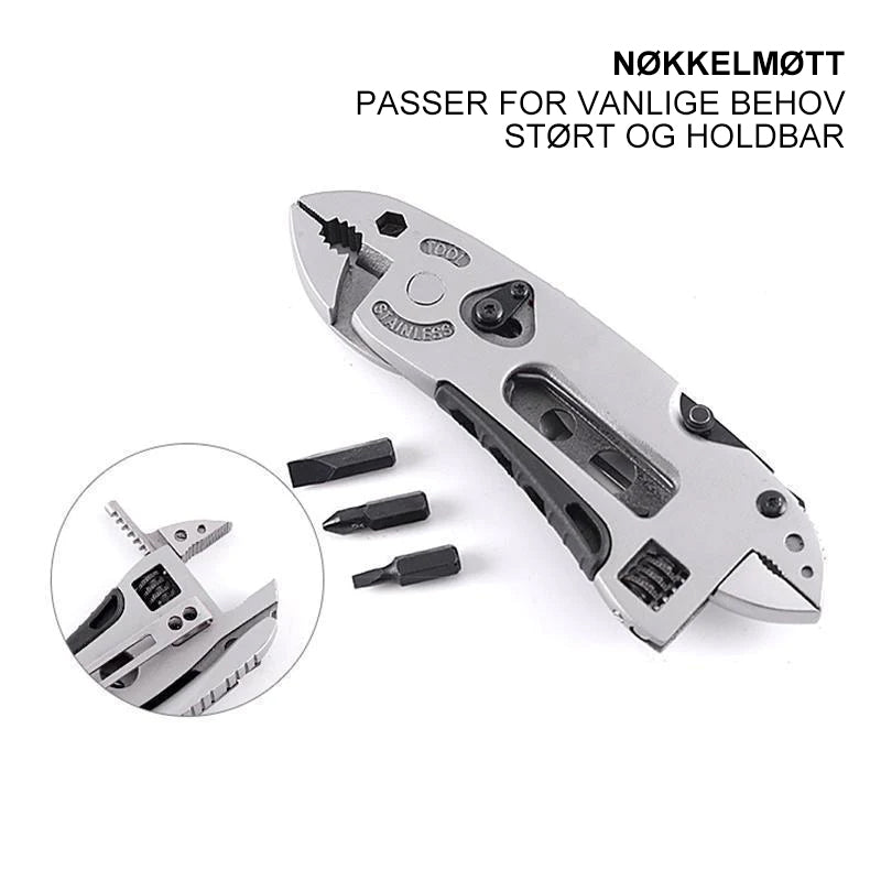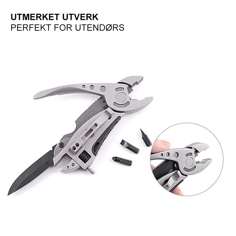 Dette allsidige verktøyet integrerer flere funksjoner, inkludert skiftenøkler, kniver, tang, skrutrekkerbits og mer, noe som gjør det til et virkelig multifunksjonelt og praktisk verktøy for ulike situasjoner.