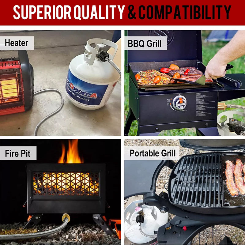 Crafted from 100% solid brass and durable rubber, our hose and components ensure long-lasting durability and resilience against various environmental factors. CSA-certified, this propane hose guarantees airtightness and stability for a safe and reliable propane setup. -