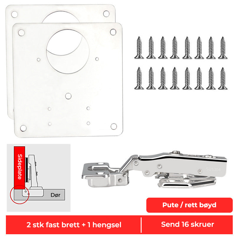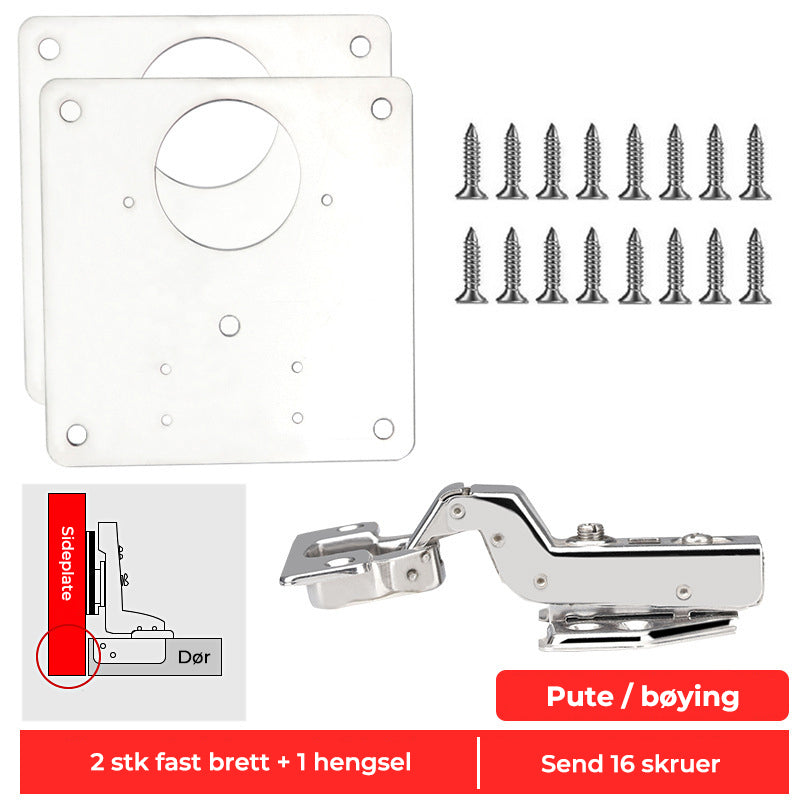 - 1 SETT* skapdørhengselsett (2 festeplater + 1 hengsel (med 16 skruer)