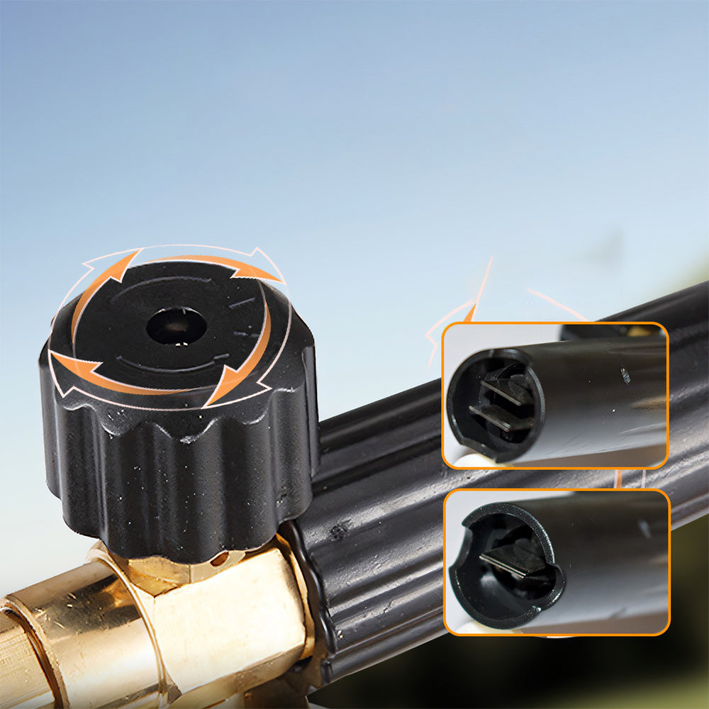 Dette allsidige verktøyet har en unik design med to forskjellige koblingsender - en lengre en for kraftvaskemunnstykket og en kortere for snøskumlansen. Dette strategiske arrangementet sikrer uhindret vannstrøm når du bruker dysen, selv med skumdispenseren tilkoblet.