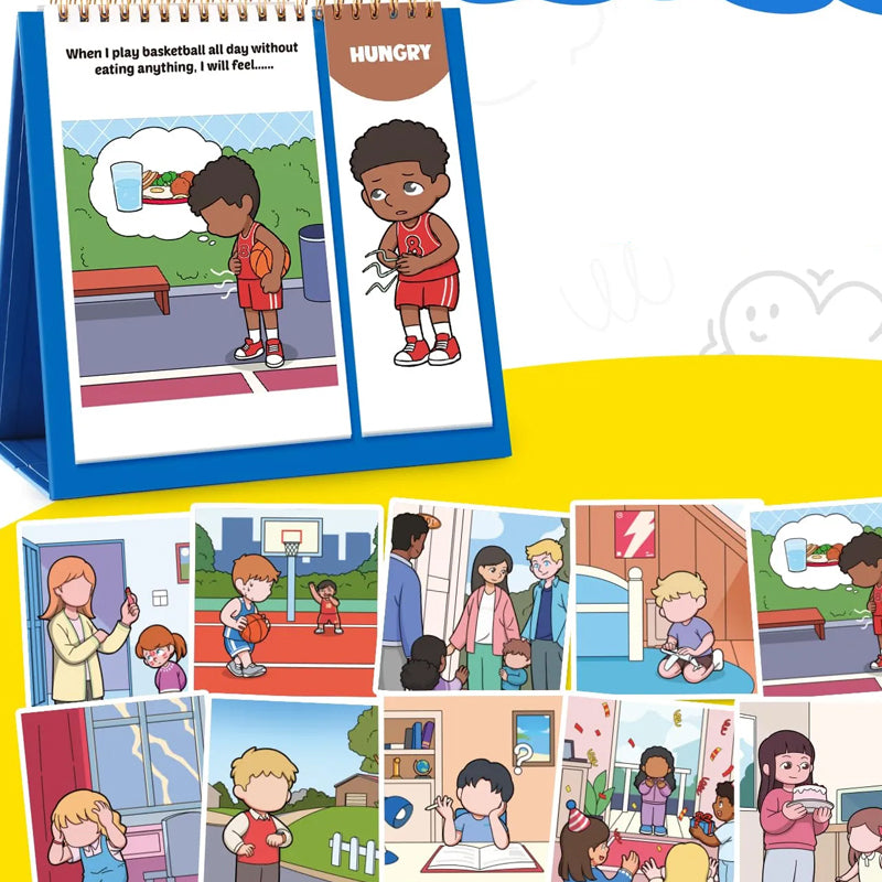 - PAGES: Double-sided flipbook with 20 emotions and practical tips
