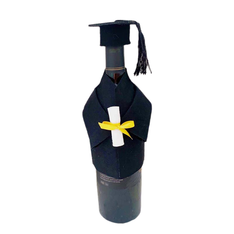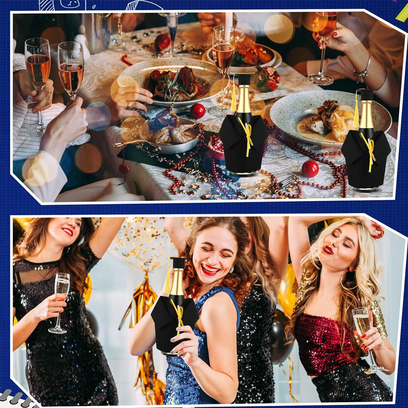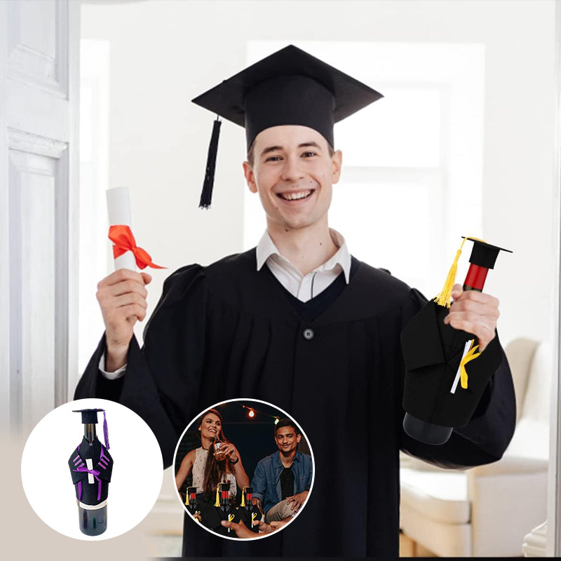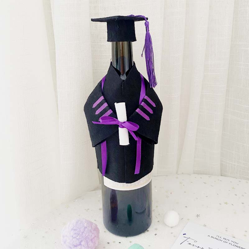 Long Time Service: cap and gown decorations are felt materials, handmade, nice quality, strong, and reusable; You can wear them on the wine or champagne bottle, they are easy to use and, ideal way to decorate a wine bottle or table