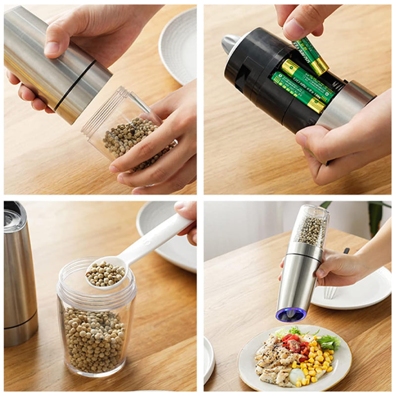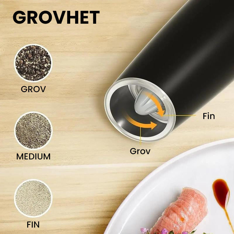 - ăJusterbar grovhetă: Det elektriske salt- og pepperkvernsettet har justerbar grovhet, og gir den perfekte malingen for ethvert krydderbehov, fra fine til grove teksturer.