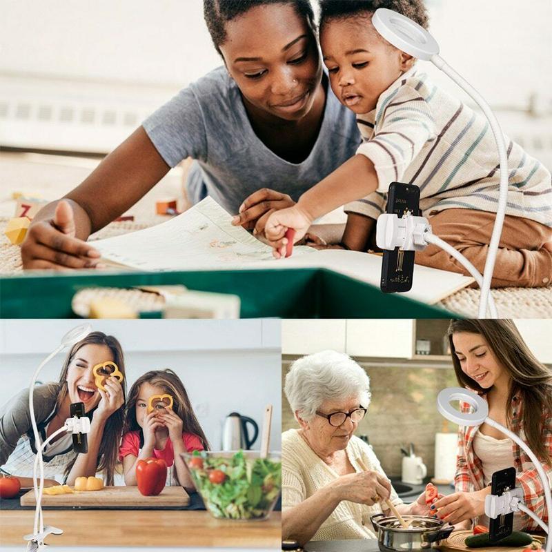 ✔️ CREATE HANDS-FREE CONTENT: Our smartphone holder is compatible with all smartphones on the market. Featuring an extra rubber blanket to protect your beloved phone from any scratching. The light is also controlled with an on/off switch on the cord that allows you to control the brightness and lighting mode, making it very easy to use.